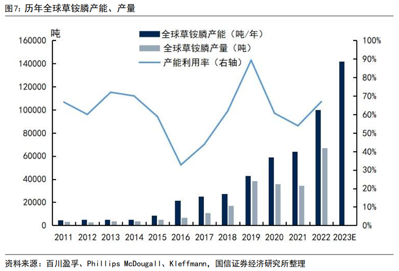 受讓部分百草枯禁限用退出的市場。百草枯價格低廉,對惡性闊葉雜草特效,除草更徹底,且雜草沒有抗藥性、對環(huán)境友好,但其對人毒性較大,無特效解毒劑。2017 年以前,我國每年使用百草枯水劑超過 10 萬噸,2016 年 7 月 1 日起國內(nèi)百草枯水劑已停止使用,百草枯產(chǎn)品只能用于出口,不得在境內(nèi)銷售。根據(jù) PhillipsMcDougall 統(tǒng)計,2018 年全球百草枯使用量達(dá)到 7.9 萬噸,全球市場銷售額達(dá)12.02 億美元,2020 年已降至 8.5 億美元。百草枯的單位用量約為草甘膦的 1/3,草銨膦的 4/5,敵草快的 2/3,但百草枯的持效期較短,因此施用頻率比草甘膦、草銨膦等除草劑要高,假設(shè)百草枯的施藥頻率為其他除草劑的 2 倍,考慮到迄今為止沒有一種除草劑可以完全替代百草枯,假設(shè)百草枯退出的市場缺口被草甘膦、草銨膦、敵草快按 4:4:2 的比例承接,則其他除草劑新增需求量大致等于百草枯被禁限用的量。而根據(jù)利爾化學(xué) 2023 年定增公告,隨著國際禁限用的擴(kuò)大,巴西、中國、泰國、馬來西亞、越南等國家都開始禁用百草枯,全球累計禁用達(dá)到 2.6萬噸左右,這為其他非選擇性除草劑帶來約 2.6-3 萬噸的需求增量。我們假設(shè)約4 成百草枯退出的市場被草銨膦承接,則該部分對應(yīng)約 1-1.2 萬噸/年的草銨膦需求量。