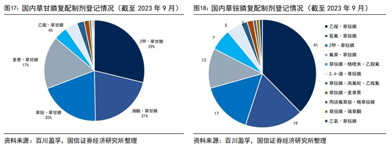 與草甘膦及其他除草劑的復(fù)配使用打開草銨膦需求增長空間。目前全球有超 200種雜草生物型對 26 種已知作用機(jī)理除草劑類型中的 23 類產(chǎn)生了抗藥性。草甘膦作為全球第一大除草劑,使用時間超 50 年,1996 年以來全球范圍內(nèi)抗草甘膦雜草的報道頻率逐年增加,據(jù)世界除草劑抗性行動委員會統(tǒng)計,目前全球已有超 50種農(nóng)田雜草對草甘膦產(chǎn)生了抗藥性。從農(nóng)業(yè)實踐看,草甘膦和草銨膦復(fù)配對部分耐草甘膦的惡性雜草如牛筋草、小飛蓬等除草效果較好,可以起到解決抗藥性、擴(kuò)大殺草譜的效果,使得兩種除草劑在性能上實現(xiàn)互補。據(jù)中國農(nóng)藥信息網(wǎng),截至 2023 年 9 月,國內(nèi)共有 59 個草銨·草甘膦復(fù)配產(chǎn)品登記,在所有與草甘膦復(fù)配的品種中排名第三。除與草甘膦復(fù)配外,草銨膦還可以與乙羧氟草醚、高效氟吡甲禾靈、丙炔氟草胺、敵草隆、西瑪津和 2 甲 4 氯等多種除草劑進(jìn)行配伍,可以起到提高防治范圍、顯著延長持效期、擴(kuò)大殺草譜、提高環(huán)境兼容性等作用。