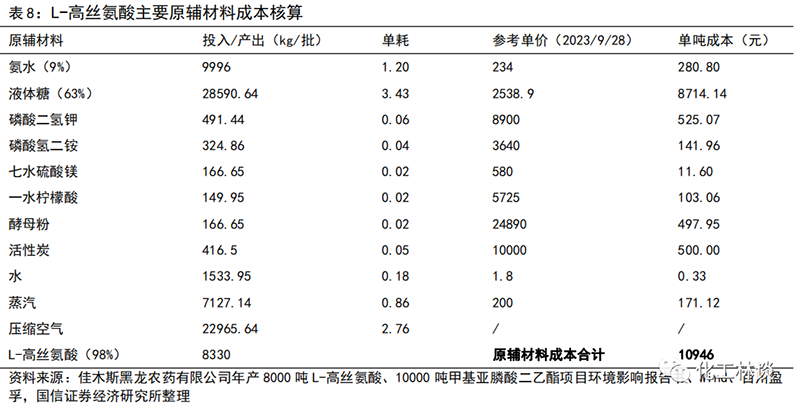 L-高絲氨酸法的關(guān)鍵在于 L-高絲氨酸、中間體的穩(wěn)定供應(yīng),技術(shù)成熟后成本優(yōu)勢將逐漸顯現(xiàn)。根據(jù)泰盛化工、匯盟生物等公司的相關(guān)項目環(huán)評公告及百川盈孚、wind 等平臺提供的相關(guān)原輔材料價格信息,我們測算出以葡萄糖為原料使用生物發(fā)酵法生產(chǎn) L-高絲氨酸的主要原輔材料成本約 1.1 萬元/噸。同時,根據(jù)湖北泰盛化工有限公司 L-草銨膦原藥及制劑項目環(huán)境影響報告書中 L-草銨膦的物料平衡表,剔除掉溶劑等重復(fù)使用的物料,我們測算出理論上 L-高絲氨酸法生產(chǎn)精草銨膦的主要原輔材料成本約 7-8 萬元/噸,而 L-高絲氨酸工藝的副產(chǎn)品如果全部外售也可帶來 1-2 萬元/噸的收入,沖抵部分生產(chǎn)成本。目前國內(nèi) L-高絲氨酸法精草銨膦尚實現(xiàn)工業(yè)化生產(chǎn),原因在于 L-高絲氨酸和中間體的供應(yīng)不穩(wěn)定以及工藝不夠成熟,我們認(rèn)為未來工藝成熟后 L-高絲氨酸法的成本優(yōu)勢將逐漸顯現(xiàn)。